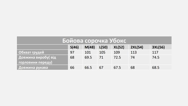 Тактична бойова рубаха убокс прямого крою з довгим рукавом та високим коміром -стійкою. Основна частина сорочки виготовлена тканини coolmax – дихаюча та при цьому зносостійка, рукава та горловина – з тканини ріп-стоп (водонепроникна та брудозахисна, з просоченням)